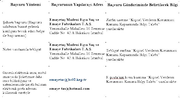 EMAYETAŞ MADENİ EŞYA SAÇ VE EMAYE FABRİKALARI T.A.Ş. KVKK BAŞVURU FORMU |